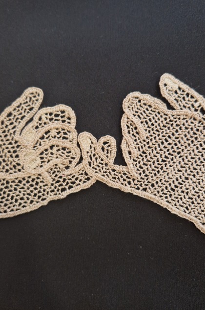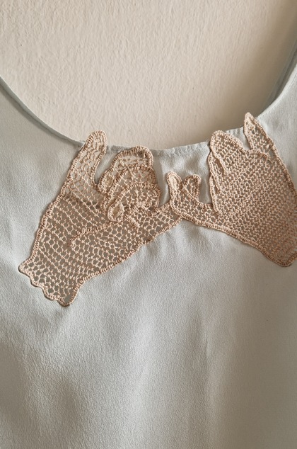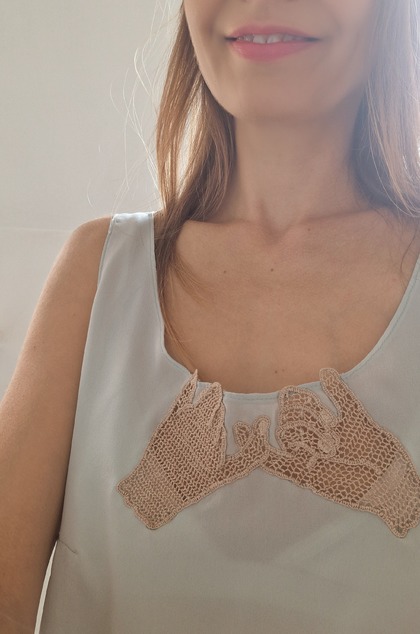 Čipku som vyhotovila technikou šitej čipky, ktorá sa používala aj v slovenských ľudových odevoch. Motív zapadá do modernej doby - ruky, spájajúce sa malíčkami v priateľskom geste - malej, ale dôležitej prísahe, ktorú som odkukala od vlastných detí. Farebná kombinácia mentolového hodvábu a krémovo béžovej čipky evokuje nočné košieľky z 30.-tych rokov. Hrubosť a surovosť ľanovej nite sa snúbi s jemnosťou látky.