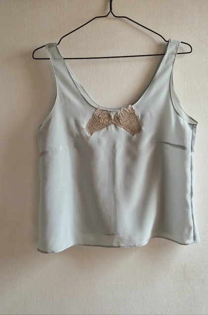 Nosím veľkosť S a top je M, preto na mne trocha "visí". Výstrih na chrbte je hlbší ako vpredu, čo pridáva topu na elegancii. Šírka cez prsia: 49 cm (obvod 98 cm) - top nemá byť priliehavý, ale voľnejší. Dĺžka od plecného šva (ten, čo leží na vrchole pleca) po dolný kraj: 54 cm