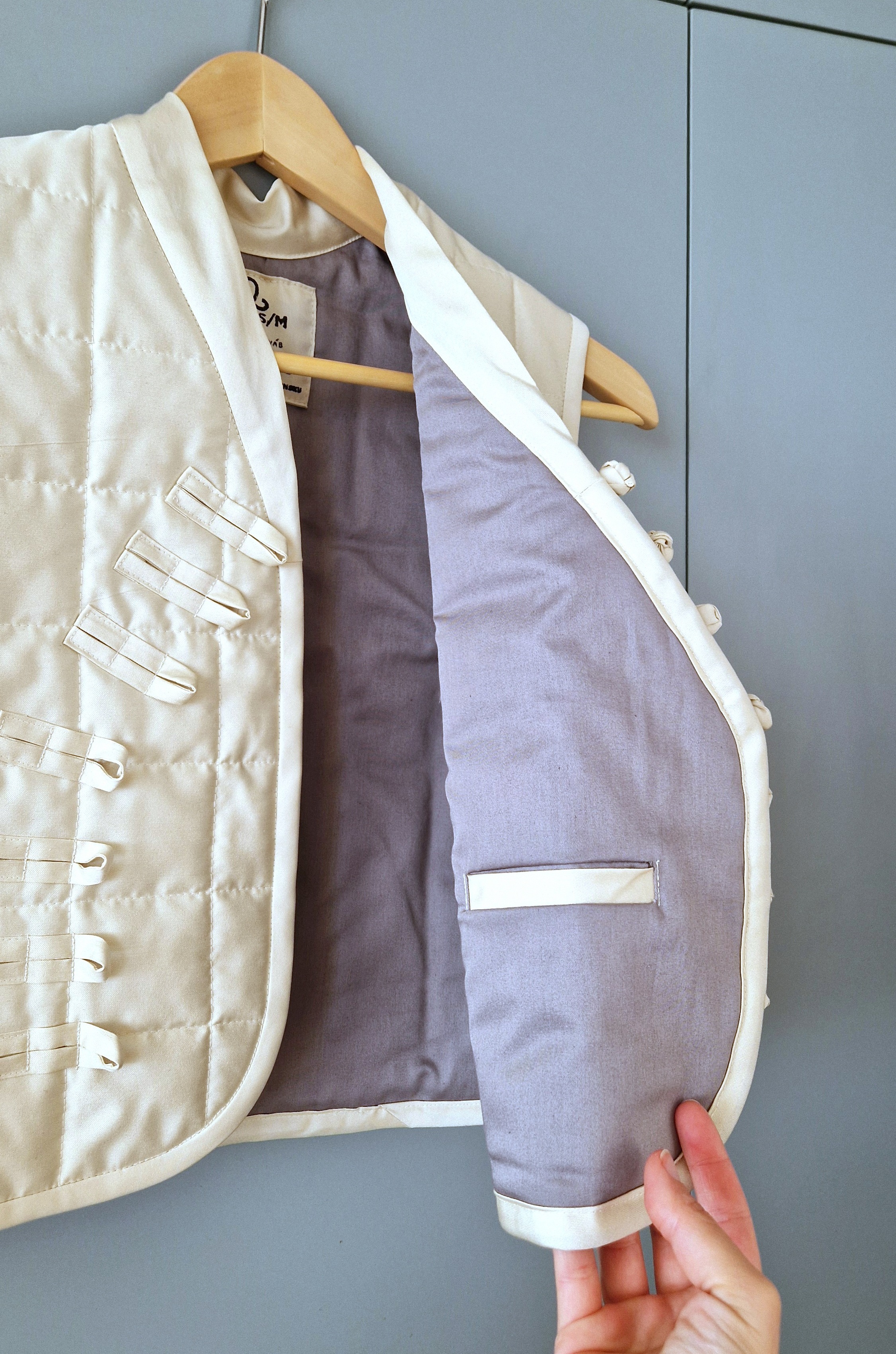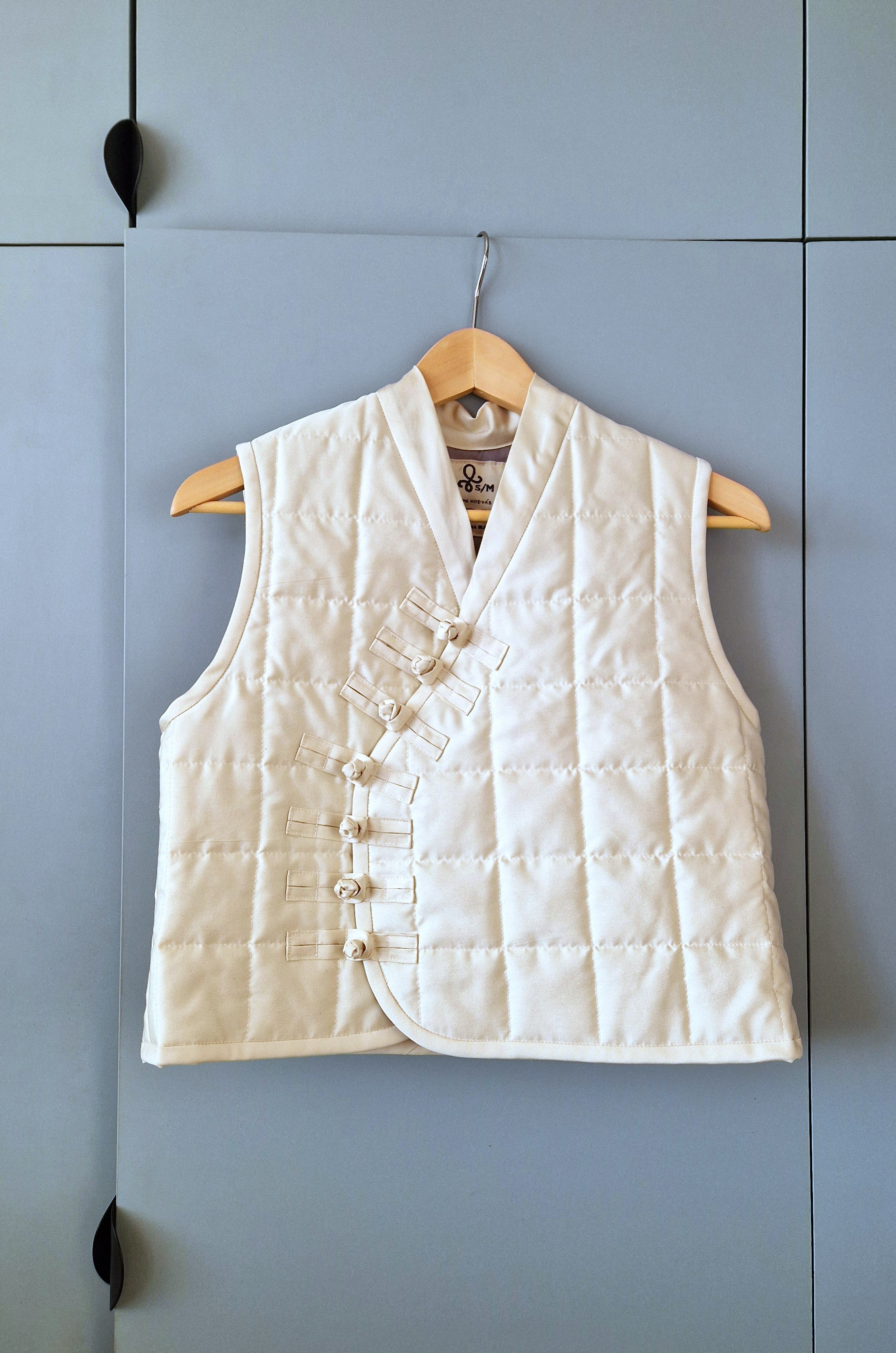 I will never get tired of Asian aesthetics. This vest is like a lovesong to Asian clothing. The slightly asymmetrical front and adorable fabric fastening make it a statement piece in your wardrobe. I like it best when paired with any classical shirt. It also looks great with dresses. It is not reversible, as the fastening only works on one side, but I have hidden a small pocket in the lining for your cell phone, for example.