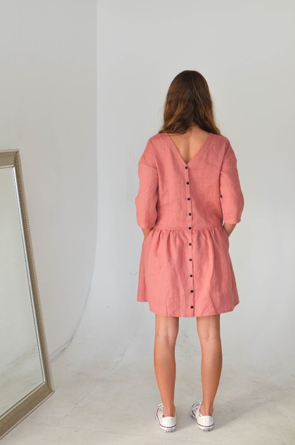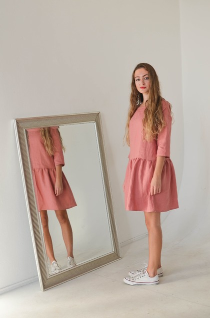 Šaty sú ušité z mäkkučkého ľanu, ktorý na sebe ani necítite. Široký oversized strih zaručuje úplný komfort pri nosení. Samozrejmosťou sú vačky všité v bočných švoch. Pás je mierne znížený.