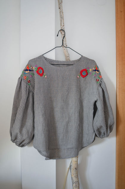 Ručne vyšívaná blúzka z jemného prémiového ľanu vo veľkosti S/M. Širší strih, zadný diel mierne predĺžený.