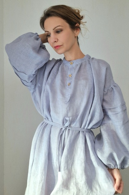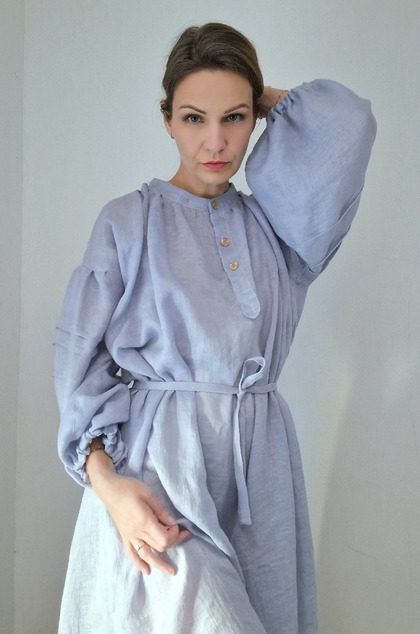 Voľné maxi šaty, ušité z jemnej ľanovej pavučinky. Jemne priesvitné. Skvele sa kombinujú so svetrom alebo vestou, v lete zasa ochránia pred páliacim slnkom.