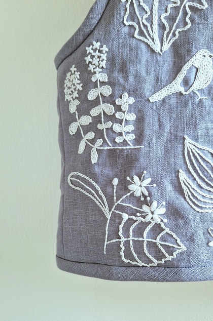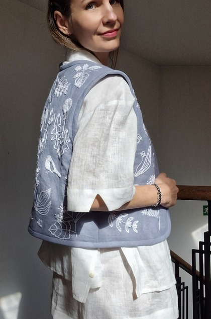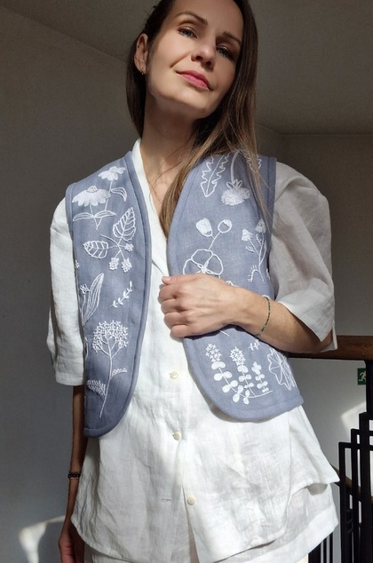 The material is 100% linen on both sides, one side hand embroidered with herbs commonly found in Slovak meadows. Technique of chain embroidery with cotton thread. The other side is plain, just vertically quilted.